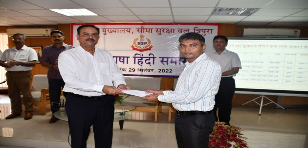 During the year 2021-22, 10 winning participants under the scheme to encourage employees to do official work in Hindi and 15 winning contestants of various Hindi competitions organized during ‘Hindi Pakhwada’ were awarded by Deputy Inspector General, (Principal Staff Officer), BSF, Tripura during ‘Rajbhasha Hindi Samaroh’ and government work for the year 2021-22.