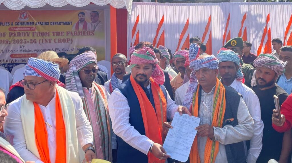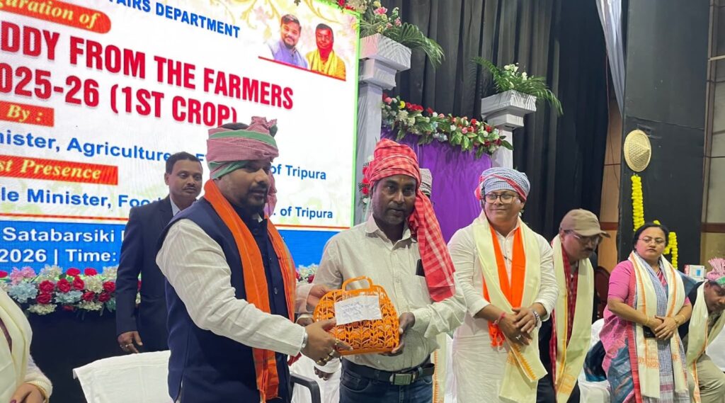 Dharmanagar, Tripura, 29th of January, 2026 : Farmers are the true food providers of the nation. Through their hard work and dedication, food reaches every household, and their contribution plays a vital role in building a self-reliant India. Agriculture remains the backbone of the country’s economy, and farmers continue to ensure national food security. With this objective, the Government of Tripura has once again taken a significant step towards safeguarding farmers’ interests. On the occasion of the first harvest of the Kharif season 2025–26, the official inauguration of the paddy procurement programme from farmers at the Minimum Support Price (MSP) under the Kharif Marketing Season (KMS) was held on Wednesday (28th January, 2026) at the Vivekananda Sardar Centenary Hall in Dharmanagar, North Tripura district. The programme was organised by the Department of Food, Civil Supplies and Consumer Affairs, with support from the Department of Agriculture and Farmers’ Welfare.The programme was formally inaugurated by the Hon’ble Food, Civil Supplies and Consumer Affairs, Minister Sushanta Chowdhury.
