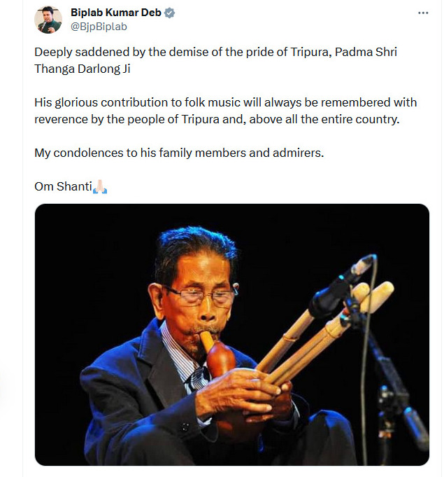 “Deeply saddened by the demise of the pride of Tripura, Padma Shri Thanga Darlong Ji His glorious contribution to folk music will always be remembered with reverence by the people of Tripura and, above all the entire country. My condolences to his family members and admirers”, Hon’ble MP and Former Chief Minister Biplab Kumar Deb tweeted.