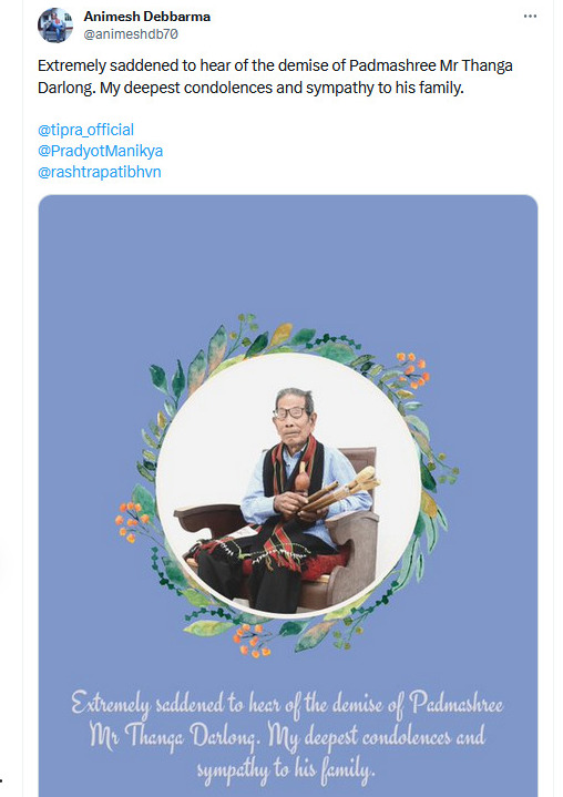“Extremely saddened to hear of the demise of Padmashree Mr Thanga Darlong. My deepest condolences and sympathy to his family”, Leader of the Opposition Party Animesh Debbarma tweeted.