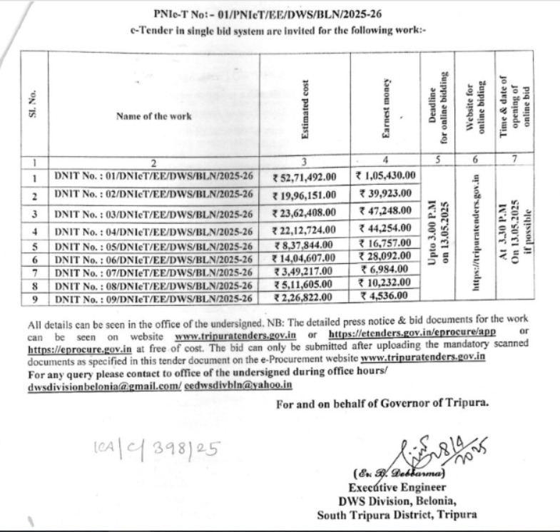 Agartala, Tripura, 3rd of May, 2025 : PNIe-T No:- 01/PNIcT/EE/DWS/BLN/2025-26.