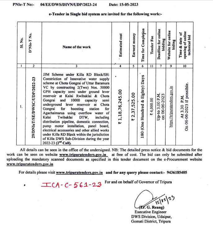 PNIe-T No : 04/EE/DWS/DIVN/UDP/2023-24 Date : 15/05/2023