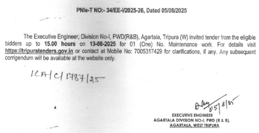 Agartala, Tripura, 7th of August, 2025 : PNIe-T NO:- 34/EE-I/2025-26, Dated 05/08/2025.