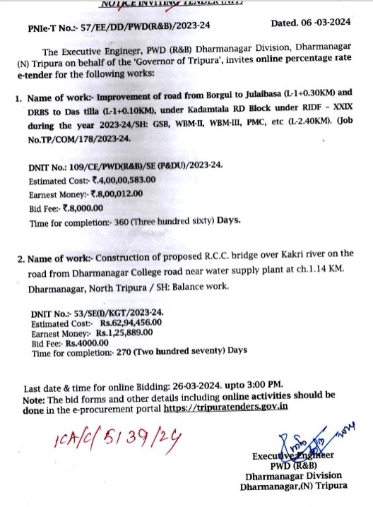PNIe-T No : 57/EE/DD/PWD(R&B)/2023-24. Dated : 06/03/2024.