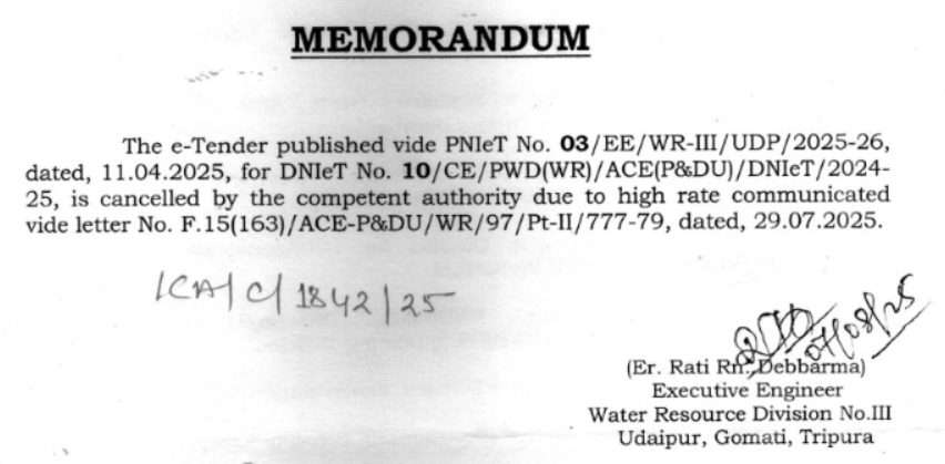 Agartala, Tripura, 12th of August, 2025 : PNIeT No. 03/EE/WR-III/UDP/2025-26, dated, 11.04.2025.