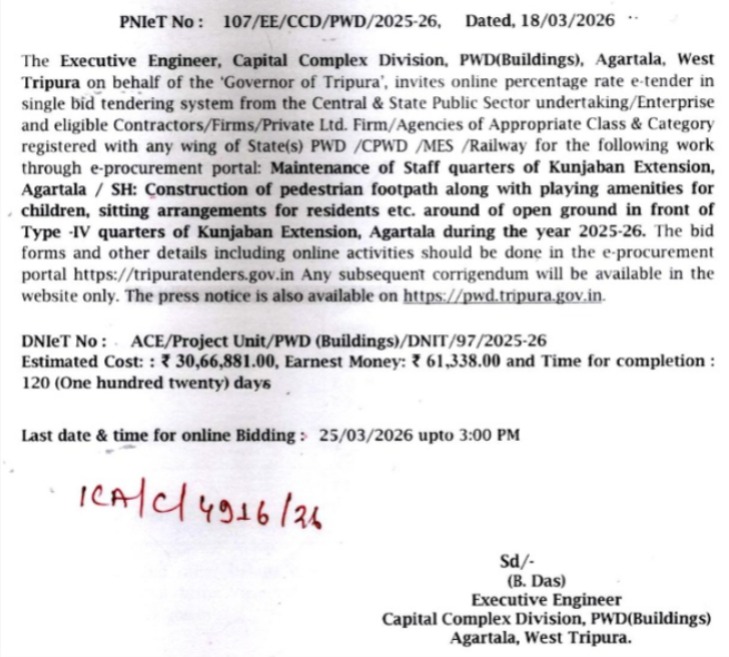 Agartala, Tripura, 19th of March, 2026 : PNIeT No : 107/EE/CCD/PWD/2025-26, Dated, 18/03/2026.