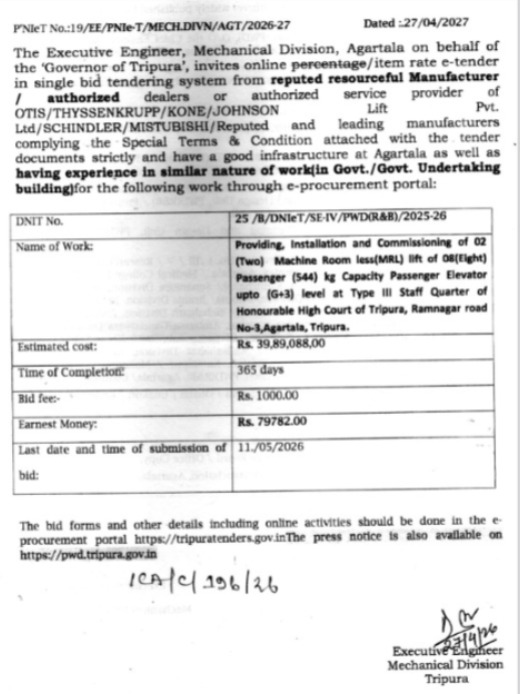 Agartala, Tripura, 30th of April 2026 : P’NIeT No.:19/EE/PNIe-T/MECH.DIVN/AGT/2026-27 Dated: 27/04/2027.