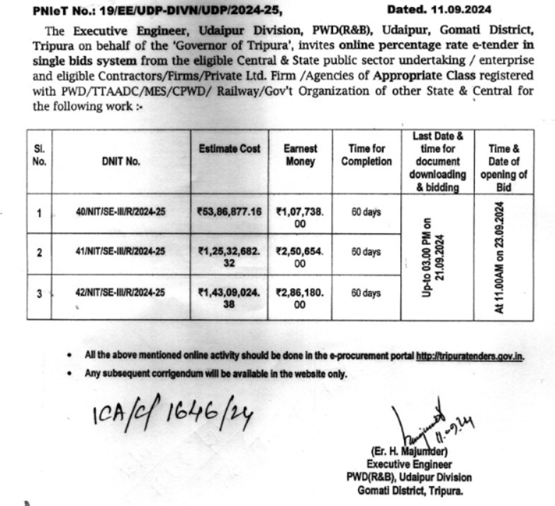 Agartala, Tripura, 13th of September, 2024 : PNIeT No : 19/EE/UDP-DIVN/UDP/2024-25  Dated : 11.09.2024.