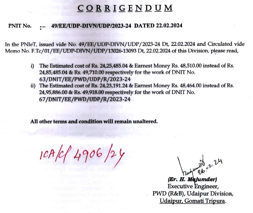 PNIT No : 49/EE/UDP-DIVN/UDP/2023-24 Dated : 22.02.2024.