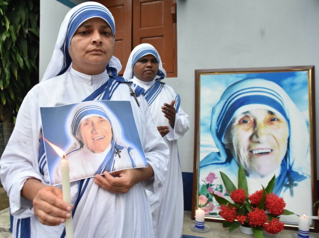 Catholic nuns from the Missionaries of Charity offer prayers on the occasion of 111th Birth Anniversary of Mother Teresa in Agartala on 26th August, 2021.