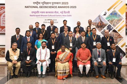 New Delhi, Delhi, 20th of August, 2024 : The President of India, Smt. Droupadi Murmu, conferred the prestigious National Geoscience Awards (NGA) for the year 2023 at a grand ceremony held today at the Rashtrapati Bhavan Cultural Centre, New Delhi. The event was graced by the presence of Shri G. Kishan Reddy, Minister of Coal and Mines, Shri Satish Chandra Dubey, Minister of State for Coal and Mines, Shri V.L. Kantha Rao, Secretary, Ministry of Mines and Shri Asit Saha, Director General of the Geological Survey of India (GSI) along with other senior officials.