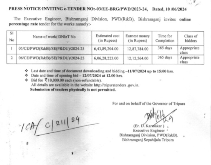 Press Notice Inviting e-Tender No : 03/EE-BRG/PWD/2023-24 Dated : 10-06-2024.