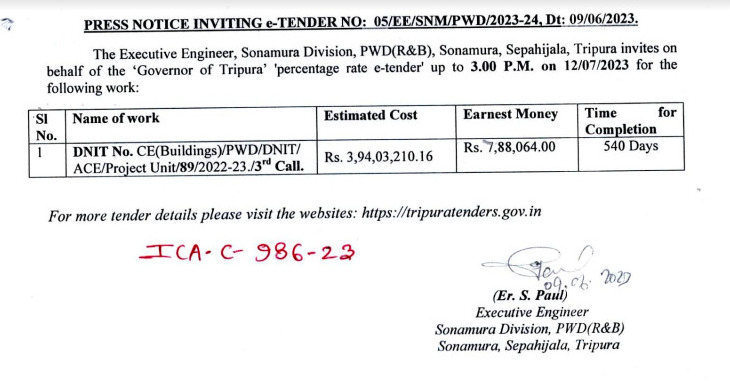Press Notice Inviting e-Tender No. : 05/EE/SNM/PWD/2023-24. Dt ; 09/06/2023