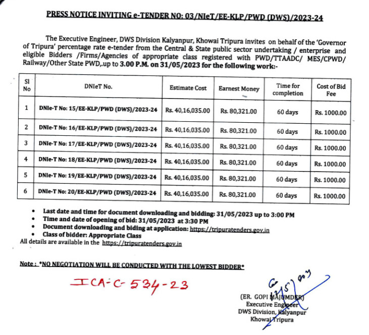 Press Notice Inviting e-Tender No : 03/NIeT/EE-KLP/PWD(DWS)/2023-24.