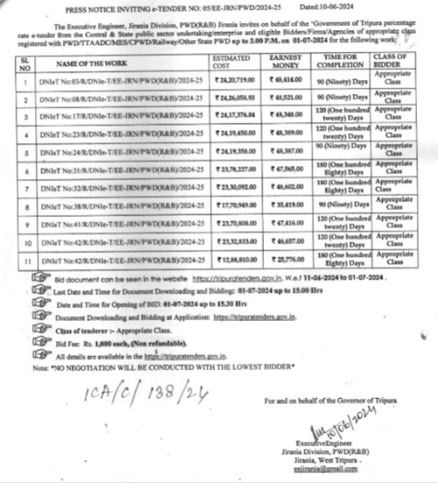 Press Notice Inviting e-Tender No : 05/EE-JRN/PWD/2024-25 Dated : 10-06-2024.