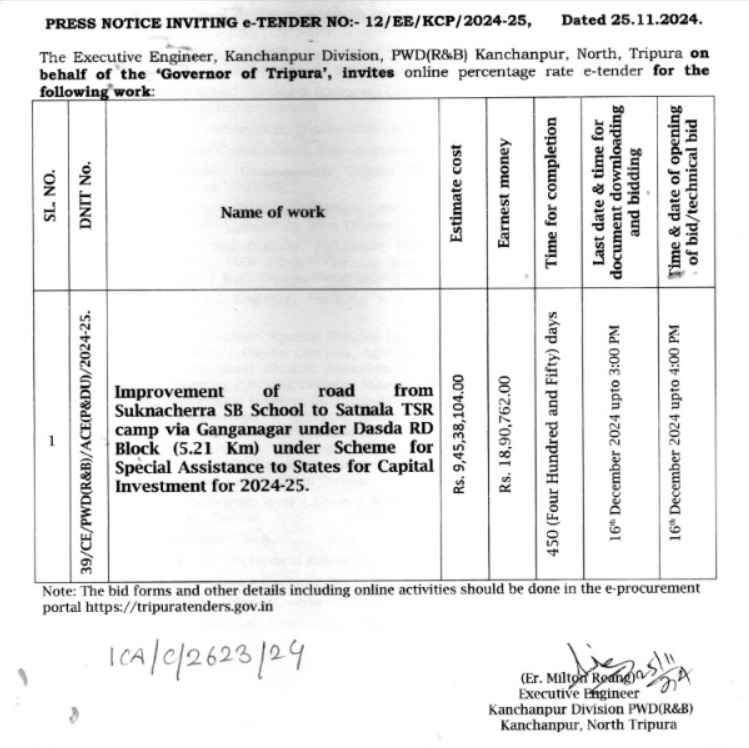 Agartala, Tripura, 27th of November, 2024 : Press Notice Inviting e-Tender No : 12/EE/KCP/2024-25  Dated : 25-11-2024.