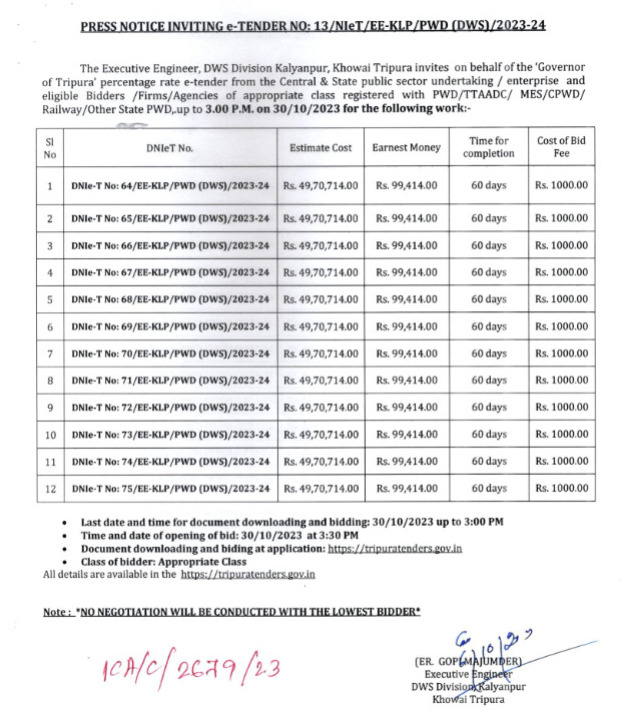 Press Notice Inviting e-Tender No : 13/ NIeT/EE-KLP/PWD(DWS)/2023-24.