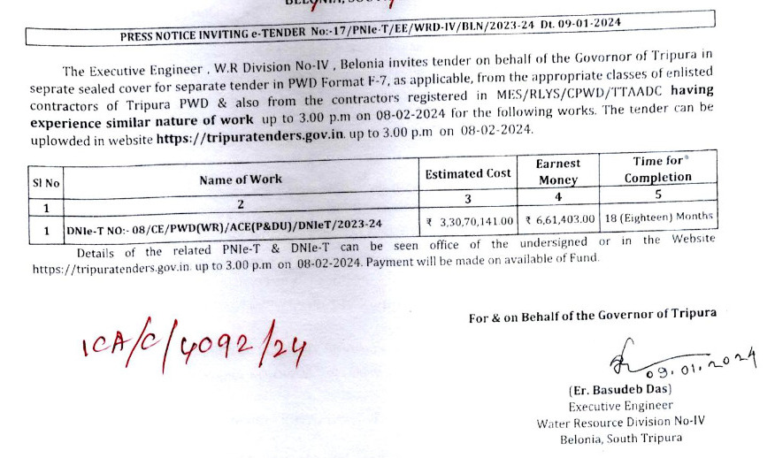 Press Notice Inviting e-Tender No : 17/PNIe-T/EE/WRD-IV/BLN/2023-24 Dt.: 09-01-2024
