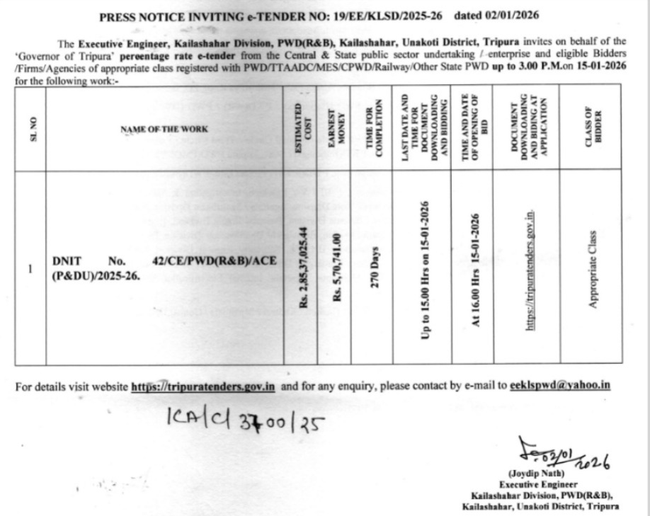 Agartala, Tripura, 3rd of January, 2026 : PRESS NOTICE INVITING e-TENDER NO: 19/EE/KLSD/2025-26 dated 02/01/2026.