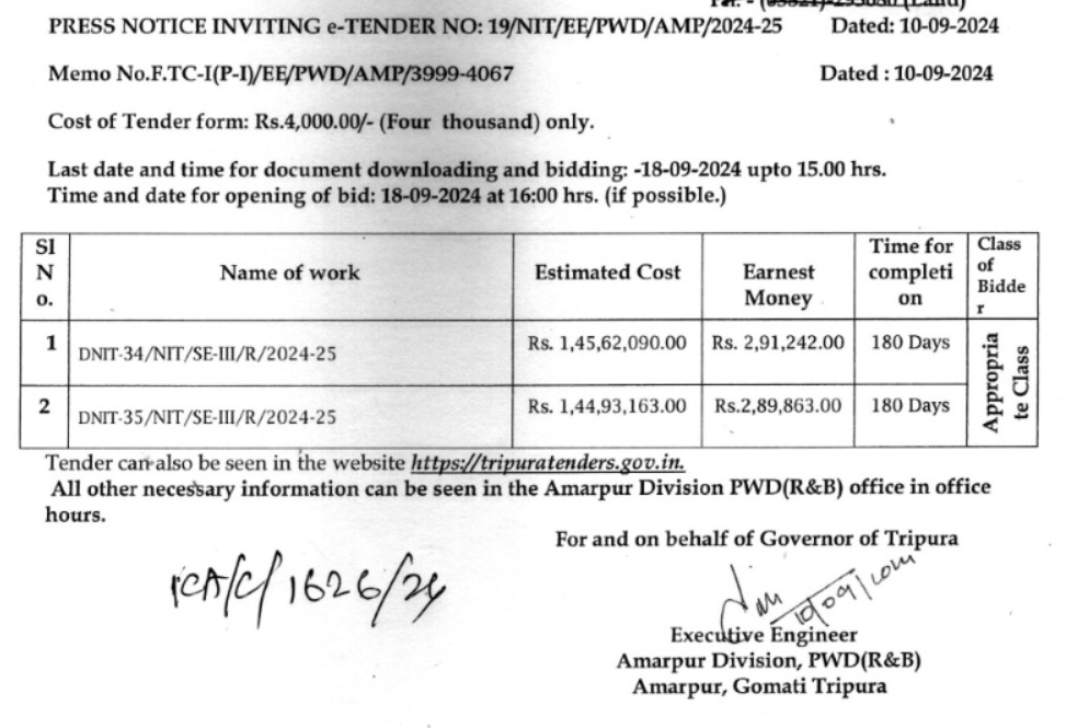 Agartala, Tripura, 12th of September, 2024 : Press Notice Inviting e-Tender No : 19/NIT/EE/PWD/AMP/2024-25 Dated : 10-09-2024.