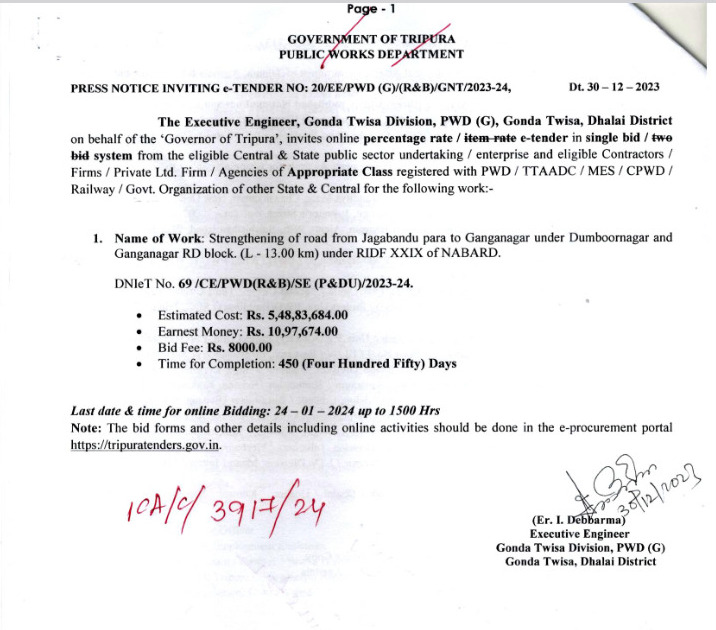 Press Notice Inviting e-Tender No : 20/EE/PWD(G)/(R&B)/GNT/2023-24 Dt. : 30-12-2023