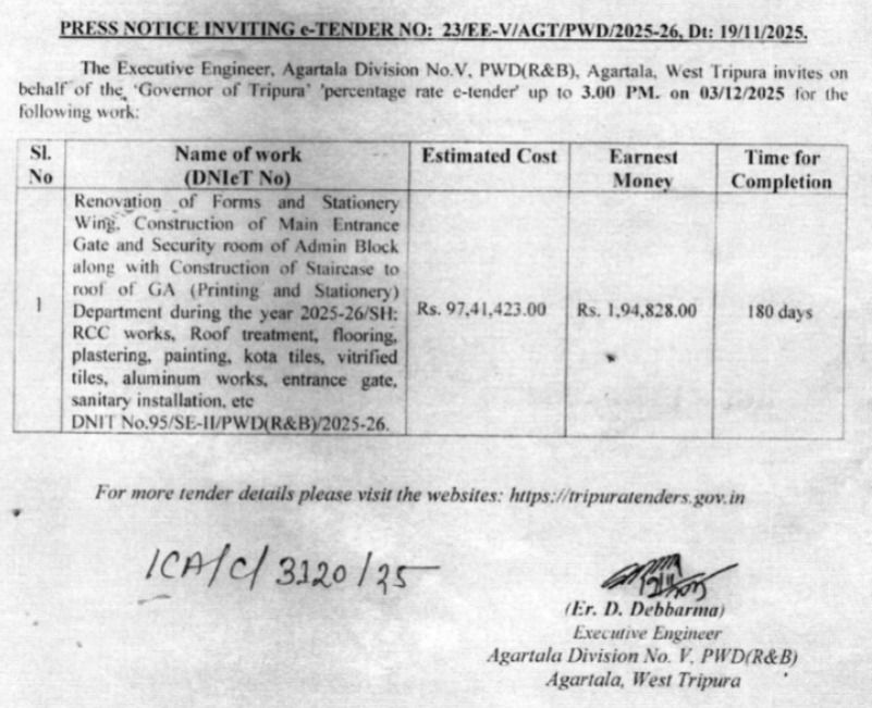 Agartala, Tripura, 26th of November, 2025 : PRESS NOTICE INVITING e-TENDER NO: 23/EE-V/AGT/PWD/2025-26, Dt: 19/11/2025.