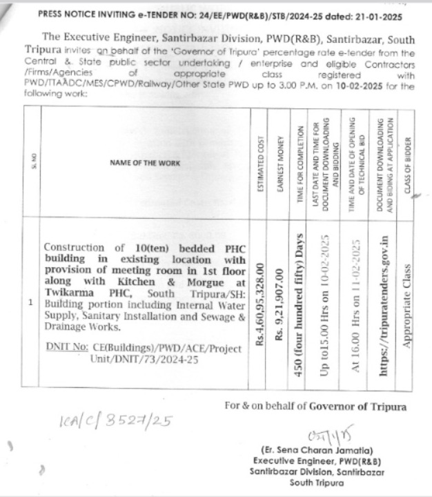 Agartala, Tripura, 30th of January, 2025 : Press Notice Inviting e-Tender No : 24/EE/PWD(R&B)/STB/2024-25 Dated, 21-01-2025.