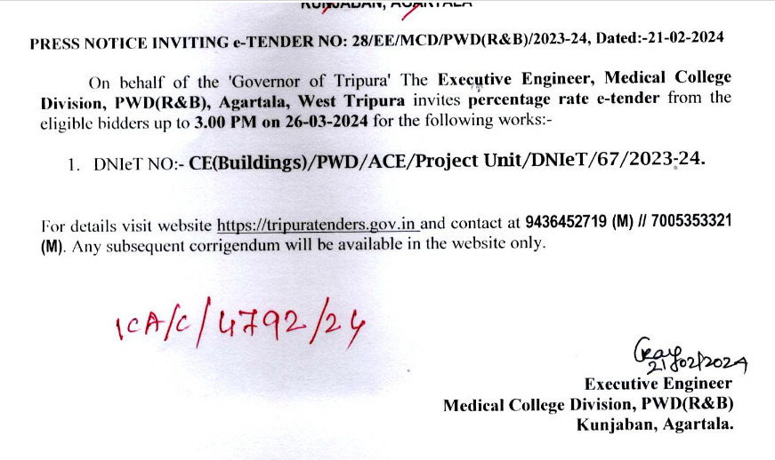 Press Notice Inviting e-Tender No : 28/EE/MCD/PWD(R&B)/2023-24 Dated: 21-02-2024