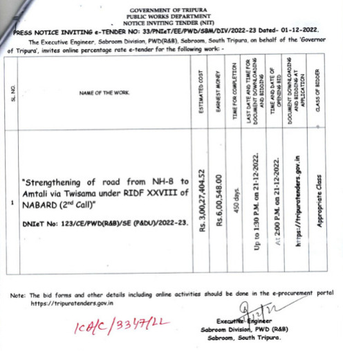 Press Notice Inviting E-Tender No : 33/PNIeT/EE/PWD/SBM/DIV/2022-23 Dated-01-12-2022.