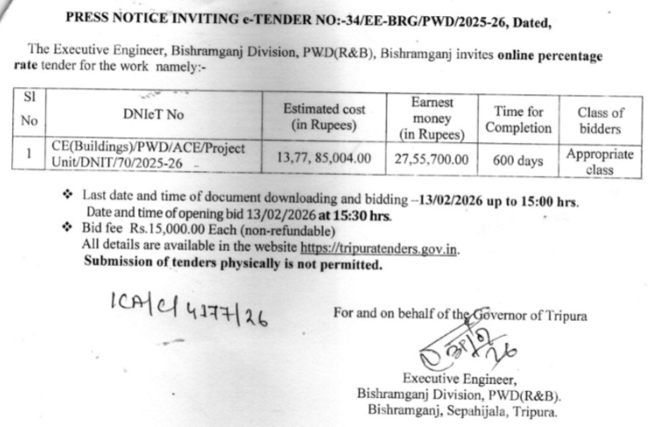 Agartala, Tripura, 7th of February, 2026 : PRESS NOTICE INVITING e-TENDER NO:-34/EE-BRG/PWD/2025-26, Dated,