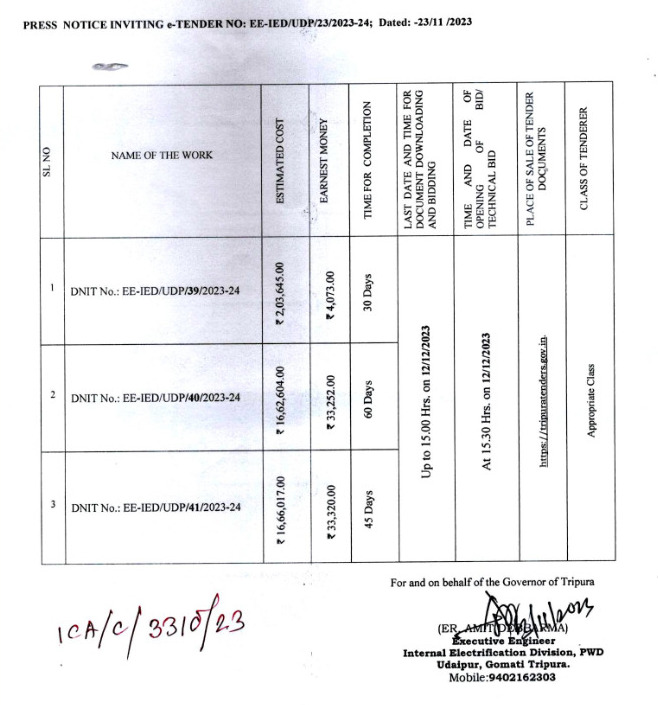 Press Notice Inviting e-Tender No: EE-IED/UDP/23/2023-24. Dated : 23/11/2023.