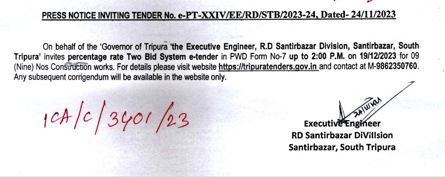 Spread the love Press Notice Inviting Tender No. e-PT-XXIV/EE/RD/STB/2023-24 Dated-24/11/2023 About The Author tripurastarnews30 See author's posts Related Continue Reading Previous Miscreants Attacked 3 Reang Villagers.Next CPI(M) Conducted Rally At Teliamura. Leave a Reply Cancel replyYour email address will not be published. Required fields are marked *Comment * Name * Email * Website Save my name, email, and website in this browser for the next time I comment. More Stories 2 min read Agartala Tripura News Observance of World Oral Health Day, 2026. March 21, 2026 tripurastarnews30 2 min read Agartala Tripura News Piping Ceremony & Conference Of 13 Bn NCC Organized. March 21, 2026 tripurastarnews30 2 min read Agartala Tripura News Raid On Drug Den In Padmapur: One Youth Detained, Police Begin Investigation. March 21, 2026 tripurastarnews30