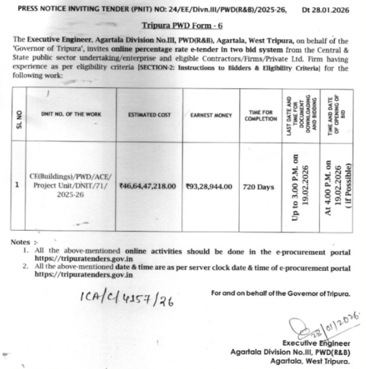 Agartala, Tripura, 7th of February, 2026 : PRESS NOTICE INVITING TENDER (PNIT) NO: 24/EE/Divn.III/PWD(R&B)/2025-26, Dt 28.01.2026.