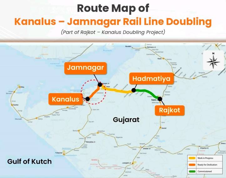 The doubling of the Kanalus–Jamnagar section will directly benefit key urban and industrial centres such as Jamnagar and Rajkot by enabling faster and more frequent train services, as well as allowing the operation of additional trains on the line. Jamnagar, a major hub for petroleum refining and brass industries, will witness improved freight evacuation, reducing logistics delays and enhancing industrial productivity. The project will also strengthen agro-based industries by enabling faster movement of farm produce and improving farmers’ access to markets. Rajkot, an important commercial centre, will benefit from improved passenger connectivity, facilitating smoother business travel and regional mobility. Additionally, enhanced rail access will boost tourism in Dwarka by improving overall accessibility and connectivity to the region.