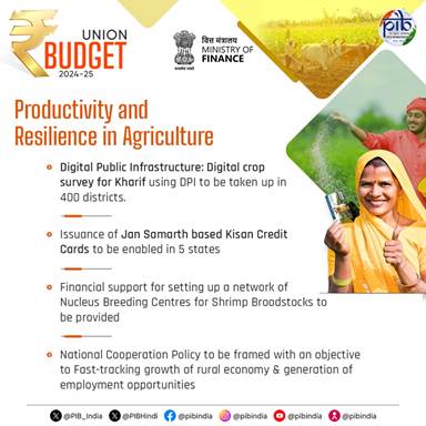 Buoyed by the success of the pilot project, the Government, in partnership with the states, will facilitate the implementation of the Digital Public Infrastructure(DPI) in agriculture for coverage of farmers and their lands in 3 years. Union Finance and Corporate Affairs Minister Smt. Nirmala Sitharaman, while presenting the Budget for 2024-25 in Parliament today, said that during this year, digital crop survey for Kharif using the DPI will be taken up in 400 districts. She said the details of 6 crore farmers and their lands will be brought into the farmer and land registries. Smt. Sitharaman added that the issuance of Jan Samarth based Kisan Credit Cards will be enabled in 5 states.