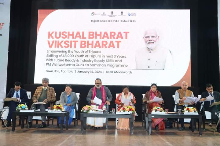 Agartala, 19th of January 2024 : In an effort to propel the Youth of Tripura with demand driven, future ready and industry ready skills, Hon’ble Minister of State, Electronics & Information Technology, Skill Development & Entrepreneurship and Jal Shakti, Shri Rajeev Chandrasekhar launched skill development initiatives in the state of Tripura under the Ministry of Skill Development and Entrepreneurship’s (MSDE) flagship scheme Pradhan Mantri Kaushal Vikas Yojana. This new iteration of PMKVY will drive the aspirations of the Youth in the state with 100+ future skills in the areas of 3D additive manufacturing, Drone Technology, Data engineering to name a few. Under this initiative, more than 48,000 youth in Tripura will be skilled in the next 3 years. The initiative also prioritizes on-the-job training and robust industry partnerships.