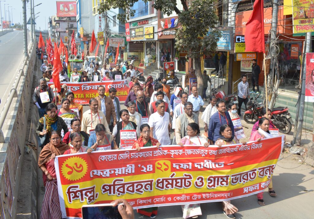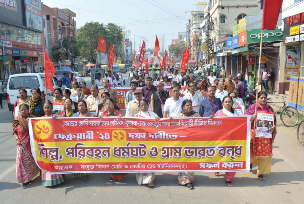 Agartala, 13th of February 2024 : With the jointly initiative of Samyukta Kisan Morcha (SKM) and Trade unions on Tuesday (13th February, 2024) organized rally in Agartala to marks the Bharat Bandh on February 16. A Nationwide ‘Bharat Bandh was called by KM and central trade unions on 16 February with various demand. As a part of, Samyukta Kisan Morcha (SKM) and Trade unions Tripura state committee organized rally in support of ‘Bharat Bandh”. State Secretary of All India Kisan Sabha (AIKS) Pabitra Kar, CPI(M) State Committee Secretary Jitendra Chowdhury and other senior leaders were participated in the rally.
