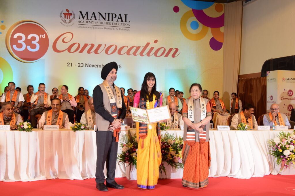 Manipal, 23rd of November 2025 : Manipal Academy of Higher Education (MAHE), Institution of Eminence Deemed to be University, continued its 33rd Convocation celebrations at Manipal on Saturday 22 November 2025, reaffirming its dedication to preparing capable graduates, driving innovation, and championing excellence across diverse domains. The occasion was graced by the presence of senior leadership of the University including Mrs. Vasanti R. Pai, Trustee of MAHE and Pro Chancellor Dr. H.S. Ballal. On Day two, 1,651 students received their degrees, including 48 PhD awardees, while 3 exceptional students were honored with the prestigious Dr. TMA Pai Gold Medal.