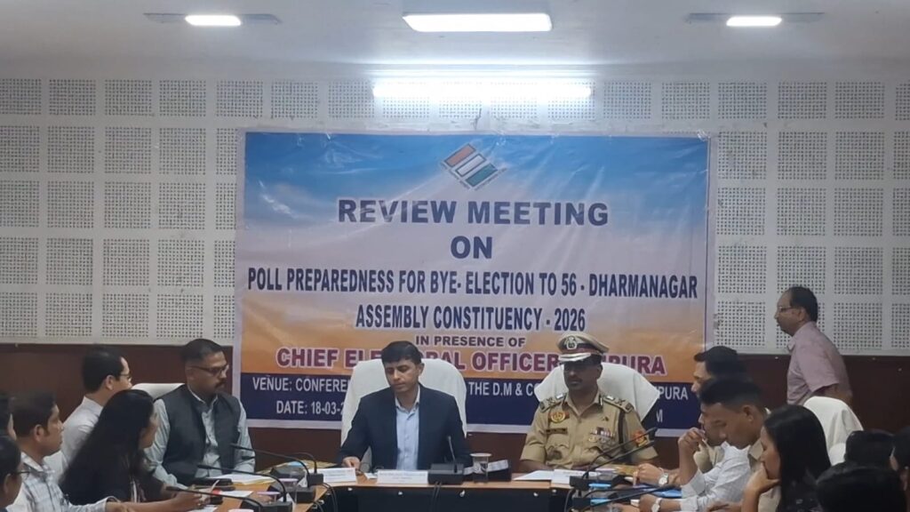 Dharmanagar, Tripura, 18th of March, 2026 : The administration has intensified its review of election preparedness ahead of the upcoming by-election in the 56-Dharmanagar Assembly constituency of North Tripura district. A key review meeting was held in Dharmanagar on Wednesday.Chief Electoral Officer Brijesh Pandey was present at the meeting. Detailed discussions were held on various aspects of the by-election, particularly focusing on the polling process, security arrangements, law and order situation, and overall administrative preparedness. Officials exchanged views to ensure smooth conduct of the election.Among those present were Additional CEO Ushajan Mog, Police Observer S. Sitesh, Additional Director General of Police (AP) G.S. Rao, District Magistrate & District Election Officer of North Tripura Chandni Chandran, Superintendent of Police Avinash Rai, along with other administrative officials.