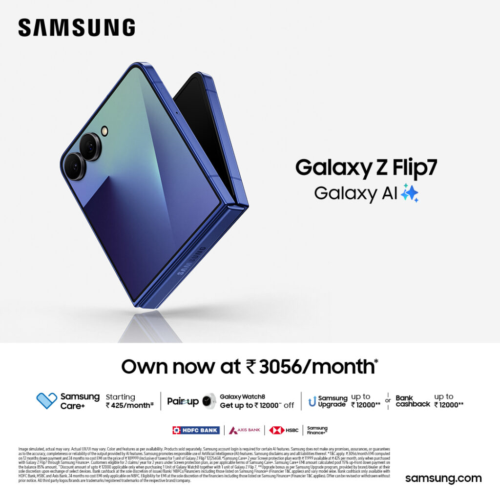 Bengaluru, Karnataka, 11th of August 2025 : Samsung, India’s largest consumer electronics brand, today announced exciting limited-period offers on the recently launched – Galaxy Z Flip7 and Z Flip7 FE. With the new offers, a bank cash back or an upgrade bonus of up to INR 12000, the Galaxy Z Flip7 will be available at just INR 97999. Similarly, the Galaxy Z Flip7 FE will be available at just INR 85999, with the bank cash back or an upgrade bonus of up to INR 10000.