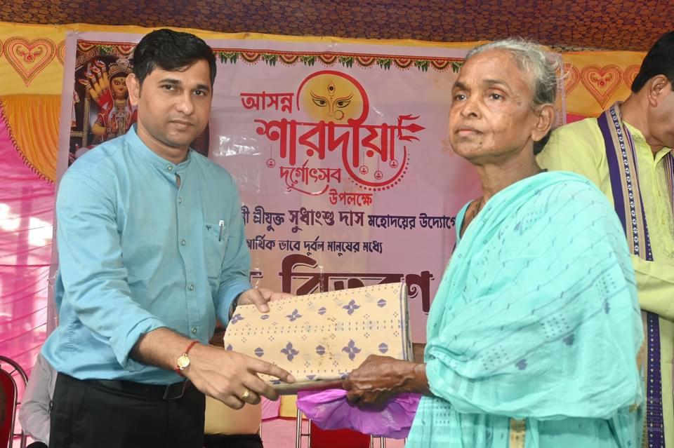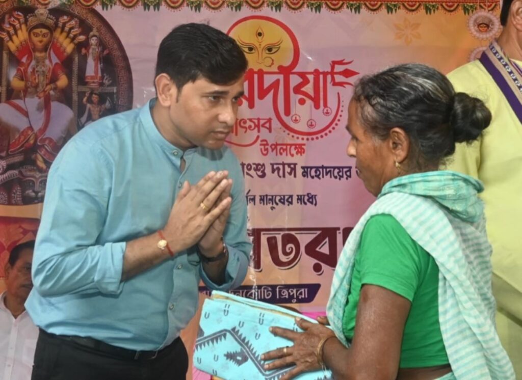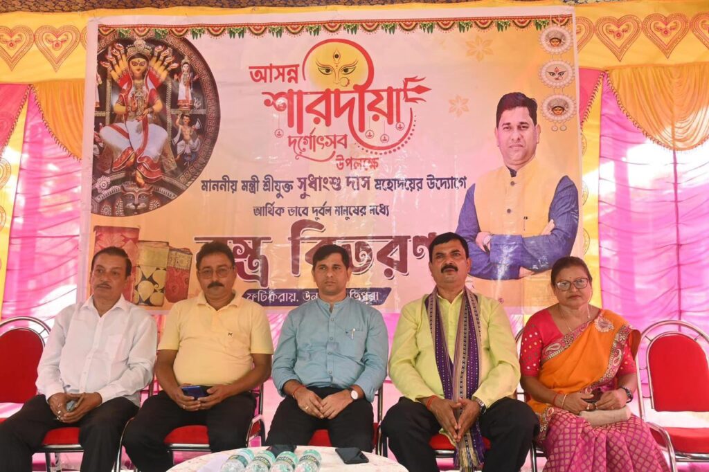 Fatikroy, Tripura, 4th of October 2024 : Hon’ble SC Welfare, ARD, Fisheries Minister Sudhangshu Das distributed clothes on the occasion of Durga Puja festival at Fatikroy Assembly Constituency on Friday (4th October, 2024). Like previous years, this year too the  minister S.Das distributed new clothes in Fatikroy of his Assembly Constituency area on his own initiative. On this day, about six hundred men and women distributed clothes and wished them Durga Puja.