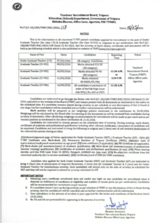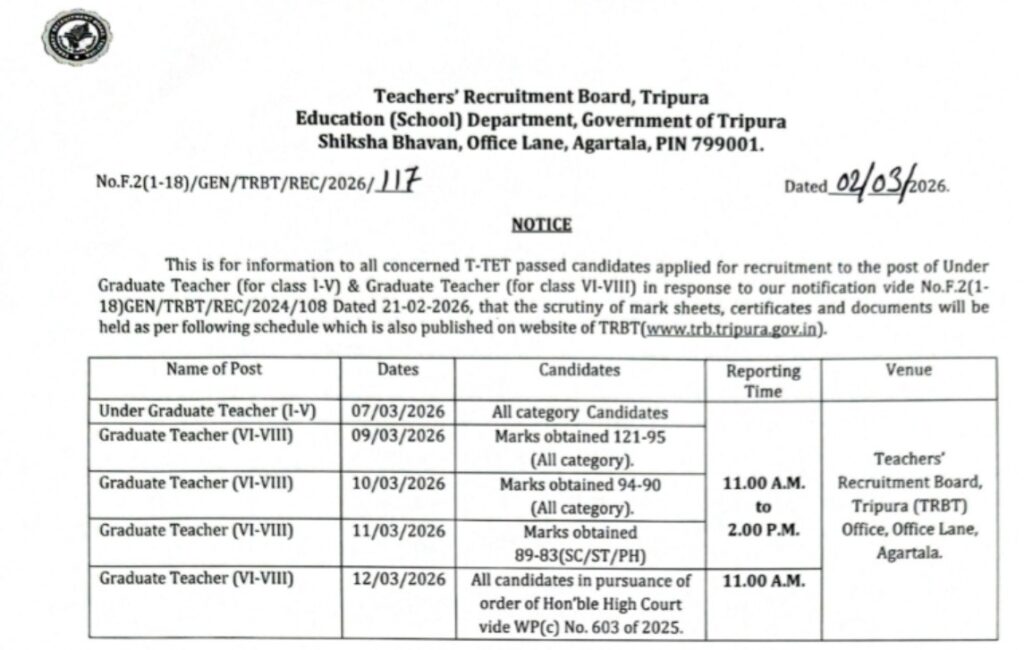 Teachers’ Recruitment Board, statement – “This is for information to all concerned T-TET passed candidates applied for recruitment to the post of Under Graduate Teacher (for class I-V) & Graduate Teacher (for class VI-VIII) in response to our notification vide No.F.2(1-18)GEN/TRBT/REC/2024/108 Dated 21-02-2026, that the scrutiny of mark sheets, certificates and documents will be held as per following schedule which is also published on website of TRBT(www.trb.tripura.gov.in).”