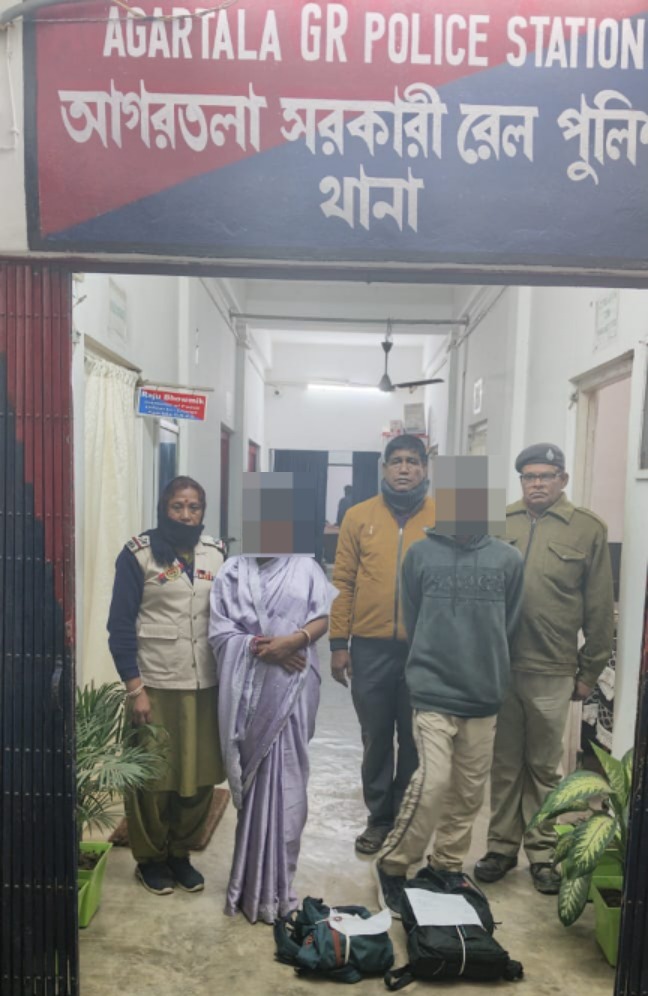 According to sources, GRP & RPF of Agartala at about 8 PM arrested two person namely Rajesh Kumar (26), S/O- Sri Rajendra Ram Of Maradi , PO-Fatepur, PS- Mufasil District- Vaishali, Bihar and Smt. Manju Devi (26), W/O- Anil Paswan Of Baldha, Shahpur , PO-Damodar Pur, PS- Nagar Nousa, District- Nalanda, Bihar at Agartala Railway Station on platform no-01 near “Agartala” sign board towards Udaipur side in-front of Agartala RPF Post along with total 04.115 Kg purported to be contraband cannabis (Ganja) in their bags respectively. The value of this Ganja is Rs- 60 thousand approximately in black market. Accordingly we have detained them and seized the contraband Ganja. A specific case vide Agartala GRPS case no-2026GRP001, U/S-20(b)(ii)(B)/29 of NDPS Act-1985 has registered against them.