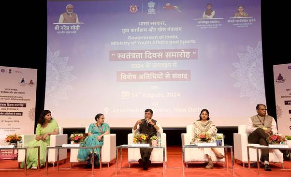 New Delhi, Delhi, 14th of August 2024 : Union Minister of Youth Affairs & Sports and Labour & Employment, Dr. Mansukh Mandaviya and Union Minister of State for Youth Affairs & Sports, Smt. Raksha Khadse engaged with a vibrant group of 500 youth volunteers at a special interactive session held in New Delhi today. The Youth volunteers, 400 National Service Scheme (NSS) volunteers and 100 MY Bharat volunteers, from across the country have been invited as special guests in the Independence Day ceremony 2024.