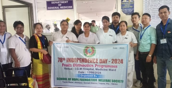 Agartala, Tripura, 16th of August 2024 : With the philanthropic initiative of the NGO organization named ‘School Of Hope Foundation Welfare Society’ a generous social work programme has been conducted here in IGM hospital medicine ward in Agartala. On the auspicious occasion of 78th independence day observation  the NGO volunteers have provided sweets and mineral water amidst the patients of the hospital including city  pedestrians. To create awareness over the deadly consequence of drugs the NGO organization volunteers has conducted a drugs awareness programme and provided good tips over the worst life destruction of drugs consumers.