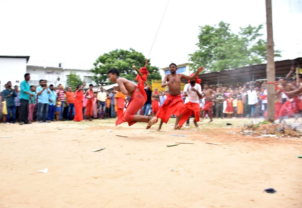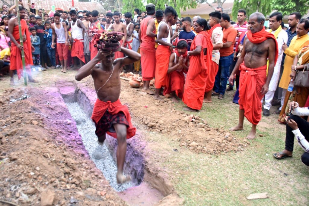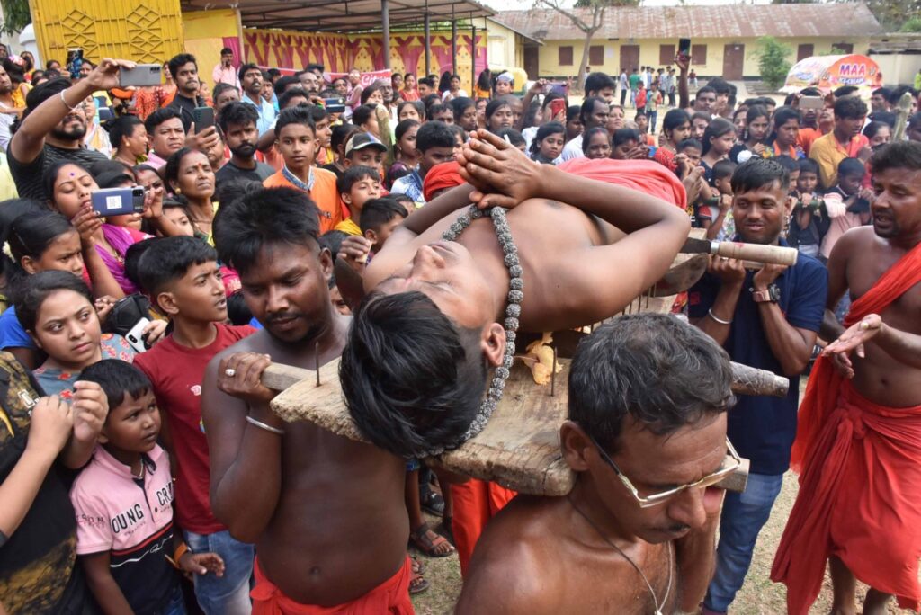 The man is walking over the fire and another one devotee lies on a bed of nails as he is carried past spectators during the ritual of Shiva Gajan at Pratapgarh village in Agartala on Thursday (14th April, 2022). Gajan festival or Charak Puja is a folk festival.
