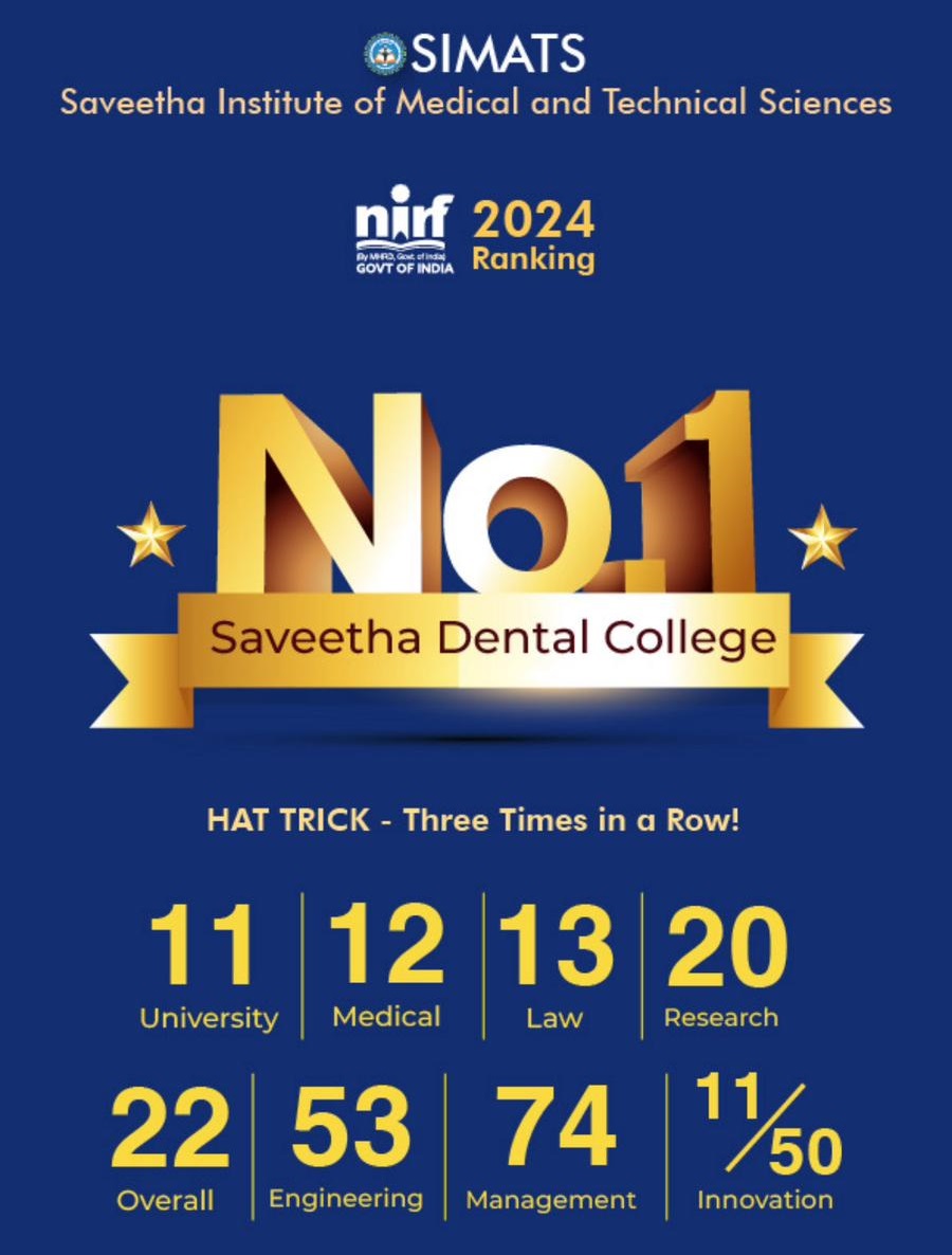 The institute has excelled in the NIRF India Rankings 2024, earning top distinctions across multiple categories. Competing against 10,885 higher education institutions – almost twice as many as last year’s 5,543 participants – the institute achieved remarkable success. It claimed the first rank in dentistry for the third consecutive year, solidifying its leadership in this domain. Furthermore, SIMATS secured impressive positions in other categories: 11th in the University category, 12th in Medical, 13th in Law, 20th in Research, 22nd Overall, 53rd in Engineering, 74th in Management, and 11 /50 in Innovation among institutions.