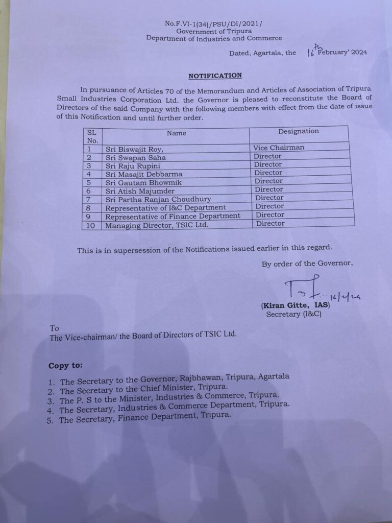 Agartala, 17th of February 2024 : Eminent Social Activist and General Secretary of 6 Agartala Mandal, Biswajit Roy has been appointed as the Vice Chairman of Tripura Small Industries Corporation Limited. Also there are 9 more directors in the management committee of Tripura Small Industries Corporation Limited. The order, signed by Kiran Gitte, Secretary of Industries & Commerce (Information Technology) Government of Tripura, was issued on Friday. Shambu Lal Chakma, MLA of Chawmanu Assembly Constituency Chairman of Tripura Small Industries Corporation Limited.