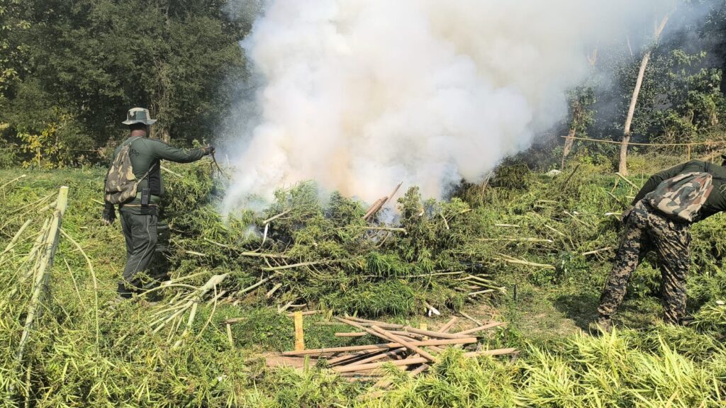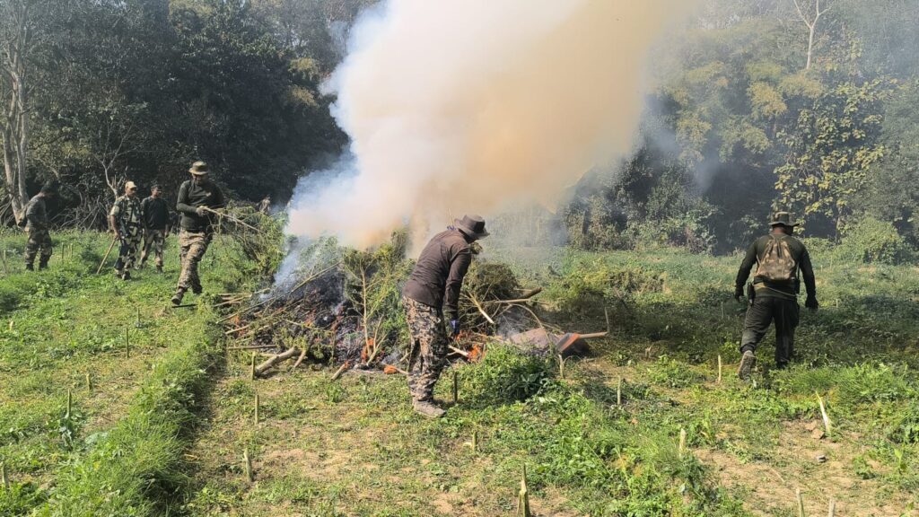 Sonamura, Tripura, 15th of February, 2026 : On the basis of secret information Sepahijala District Police, in joint operations with 81 BN BSF, TSR battalions, Forest officials and other agencies, carried out a massive crackdown on illicit Ganja (cannabis) cultivation on Sunday (15th February, 2026) from the morning 7 am at various locations of the district.