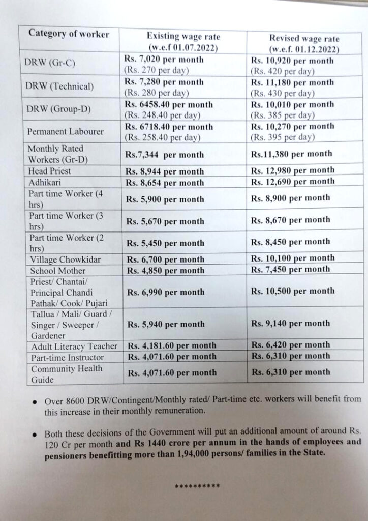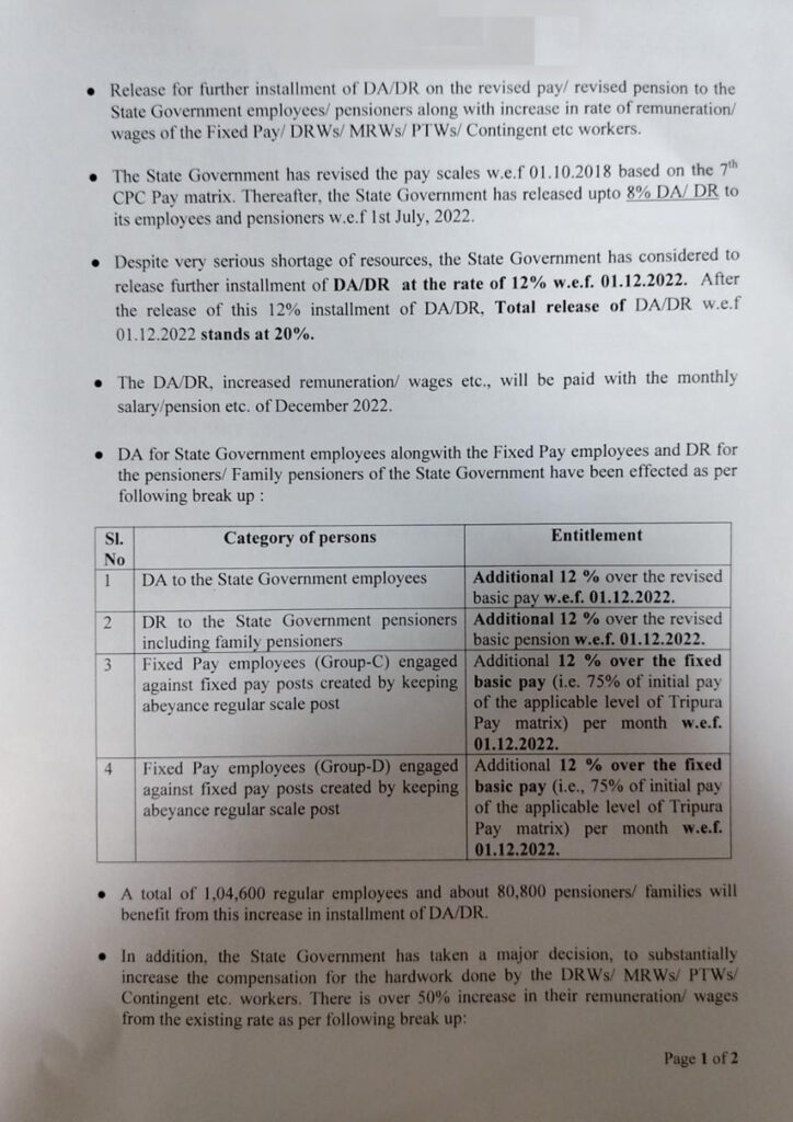 State Government announced 12% DA/DR for State Government employees & pensioners along with increase in rate of remuneration/ wages of the Fixed Pay/DRWs/MRWs/PTWs/ Contingent etc workers with effect from December 1, 2022. Hon’ble Chief Minister Dr. Manik Saha on Tuesday (27th December, 2022) announced at Press Conference 12% Dearness Allowance (DA) and Dearness Relief (DR) for State Government employees and pensioners with effect from December 1. The State Government employees’ DA has gone up from 8 % to 20 %.